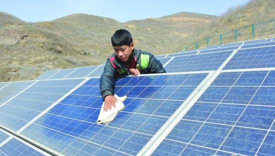 圖為工人在擦拭光伏板